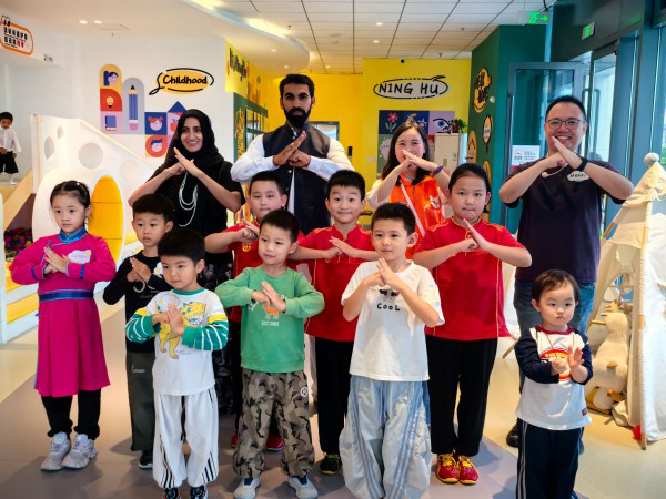 首先,中国功夫表演拉开了活动序幕。在武术教练的带领下,外国友人与孩子们一起学习中华武术的基础动作,如抱拳礼、马步、冲拳、踢腿等。在学习过程中,大家不仅体会了中华武术的力与美,也在中英文结合的教学中理解了“Horse Stance(马步)”“Punch(冲拳)”“Kick(踢腿)”“Salute(抱拳礼)”等关键词汇,感受到武德与礼仪的独特魅力。