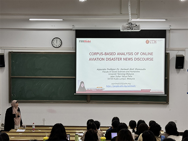 本网讯(通讯员:林清)10月15日下午,外国语学院品牌学术活动“星云讲堂”之高级职称教师系列讲座第十五期在教9-316教室顺利举行。本期讲堂特邀马来西亚理工大学语言学教授Sarimah Shamsudin担任主讲嘉宾,为全院教师带来了一场题为《在线航空灾难新闻话语的语料库语言学分析》的专题讲座,外国语学院全体教师参加了本次活动。
