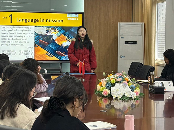 活动伊始,主讲教师张辰昕围绕《大学英语A(2)》第一单元《Language in Mission》,开展了规范完整的说课示范与全英文无生授课展示,全方位呈现了单元教学的核心设计思路与实操流程。示范内容全面覆盖教学目标设定、教学重难点拆解、教学方法甄选、教学手段运用等关键环节,张老师先结合教材编写逻辑、学生学情特点,系统阐述单元教学设计依据与整体规划,随后紧扣单元主题开展全英文无生授课演示,完整还原课堂教学流程,展现了扎实的教学功底与严谨的备课思路。